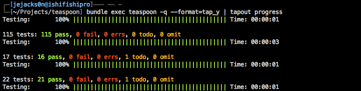You can run Teaspoon three ways -- in the browser, via the rake task, and using the command line interface (CLI).